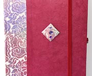 Es wurde von mir entworfen und handgearbeitet aus bedrucktem Loktapapier. Es ist mit Filmoplast eingebunden und hat innen auf der linken Seite ein Einsteckfach, z. B. für Scheckkarten oder Visitenkarten. Außerdem hat es ein Lesezeichen mit Acrylperlen.